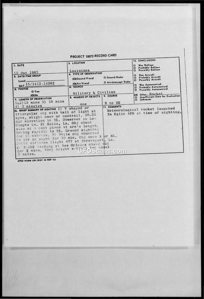 A multi-witness UAP sighting in Louisiana on May 15, 1963, was officially attributed to a meteorological rocket launch or space debris re-entry.