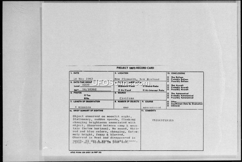 A 15-year-old witness in New Plymouth, New Zealand, reported a four-minute sighting of an extremely bright, multi-colored, silent object on May 18, 1963. The U.S. Air Force officially classified the incident as 'UNIDENTIFIED'.