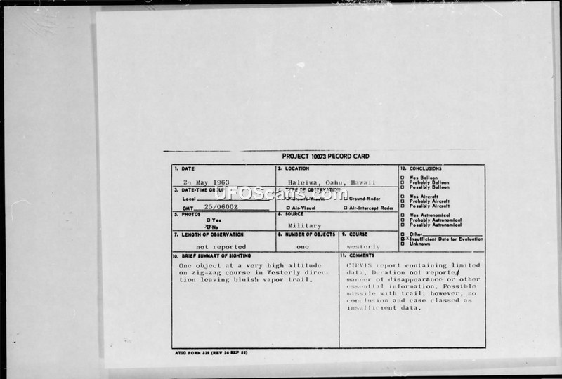 On May 24, 1963, at 0600Z, Sergeant Floyd Foster of the 326 Air Division at the Kunia Facility in Hawaii observed an unidentified object. The sighting was reported via a CIRVIS (Communication Instructions for Reporting Vital Intelligence Sightings) message. The object was described as being at a very high altitude, traveling in a westerly direction, and exhibiting a zig-zag flight path while leaving a bluish vapor trail. The report notes that the duration of the observation was not reported and that there was no radar contact or photographic evidence. The official evaluation of the incident, recorded on a Project 10073 record card, concluded that there was insufficient data to determine the nature of the object. While the report suggests the possibility of a missile, the lack of essential information led to the case being closed as having insufficient data for evaluation.