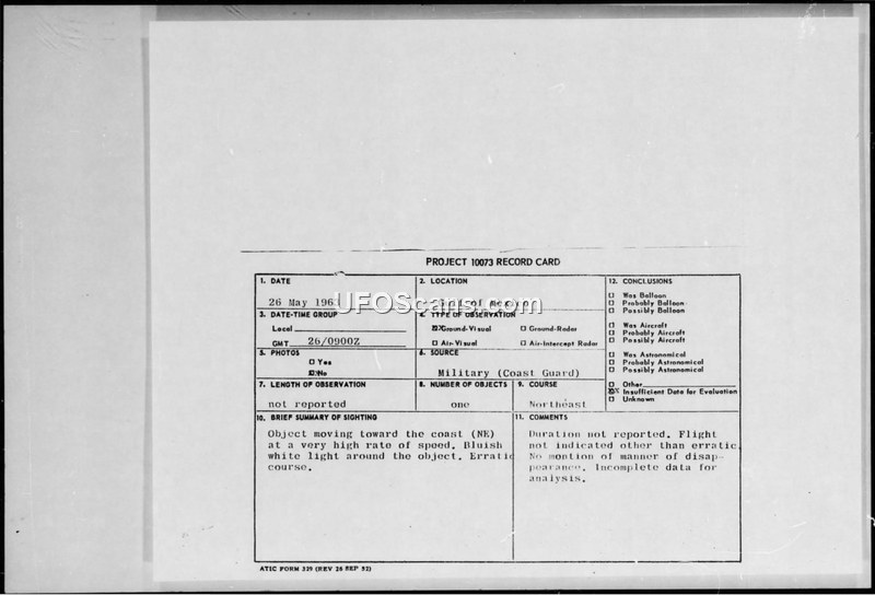 On May 26, 1963, at 0900Z, the crew of the tug SANDRA, located at coordinates 29-14 N, 93-25 W in the Gulf of Mexico, observed an unidentified flying object. The master of the vessel reported that the object was traveling at a very high rate of speed in a northeasterly direction toward the coast. The object was described as having a bluish-white light around it and was noted to be following a very erratic course. The sighting was reported via a naval message to various military commands, including CINCLANTFLT, CINCNORAD, and the Coast Guard. The official record card for Project 10073 notes that the duration of the sighting was not reported and that there was no information regarding the manner of the object's disappearance. Consequently, the investigation concluded that there was insufficient data for a formal evaluation.