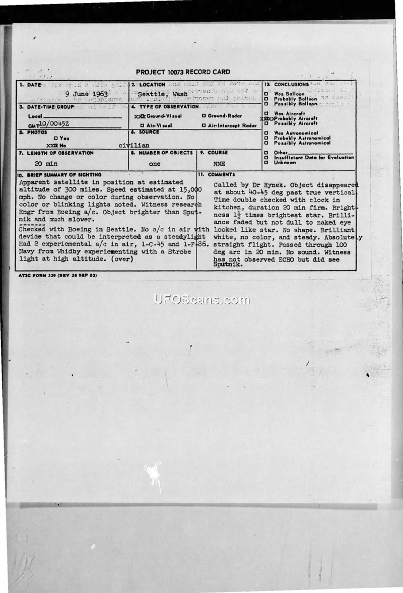 On June 9, 1963, a research engineer from the Boeing Aircraft Company, along with four other individuals, observed an unidentified object in the sky over Seattle, Washington. The sighting lasted approximately 20 minutes, from 100045Z to 100105Z. The witness, who possessed experience in plotting satellites such as Sputnik, described the object as a brilliant white light with no color or blinking features, moving in a straight path from SSW to NNE at an estimated altitude of 300 miles and a speed of 15,000 mph. The object was noted to be brighter than Sputnik but moving slower. The witness observed the object through 8x binoculars. Dr. Hynek was involved in the follow-up of the report. Official investigation by the Air Force considered the possibility that the object was a Navy aircraft from Whidbey Island that was experimenting with a high-altitude strobe light at the time of the sighting. The report notes that the satellite ECHO I was not visible in the area during the time of the observation.
