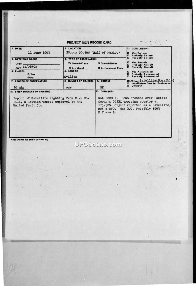 A 1963 sighting report from the M.V. Box Hill in the Gulf of Mexico was investigated by the U.S. Air Force and NASA. The object was officially identified as a satellite and not a UFO.