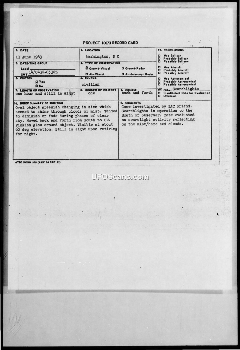 Project 10073 Record Card — Washington, D.C. Sighting, 13 June 1963