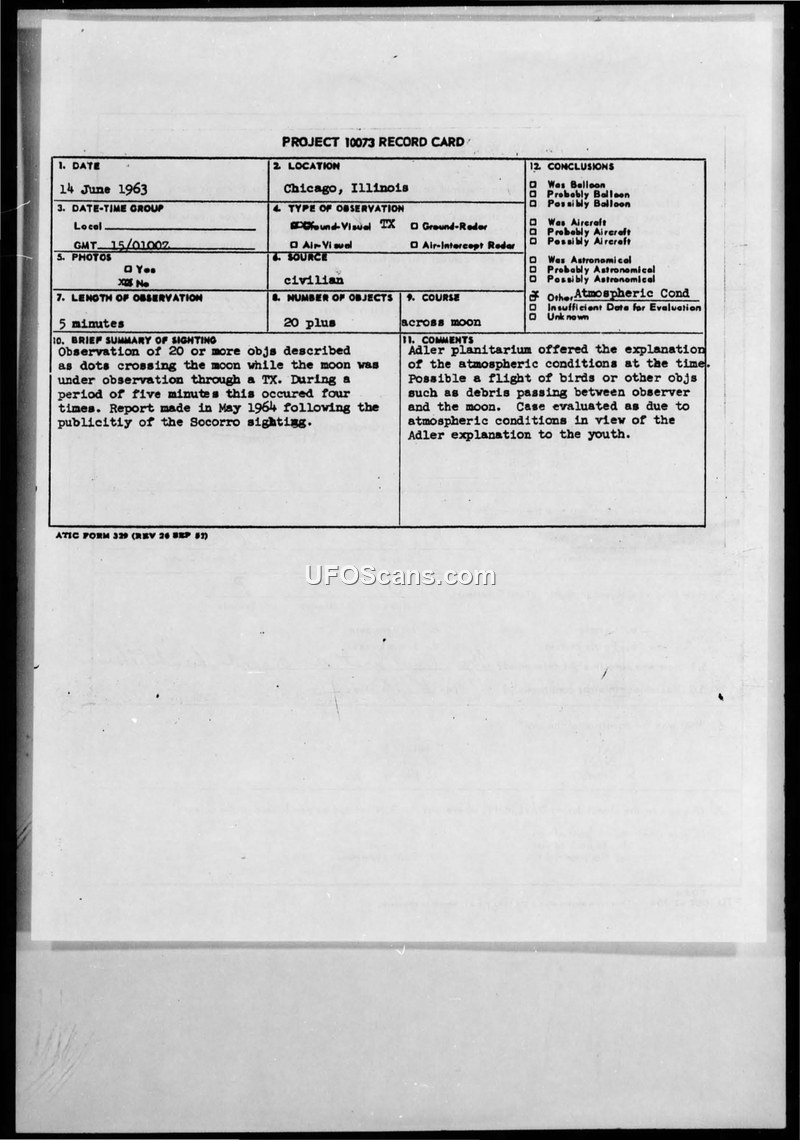 This document contains Project 10073 record cards and associated correspondence regarding two separate UFO sightings reported in Chicago, Illinois, in June 1963. The primary report concerns a 13-year-old witness who observed 20 or more black, dot-like objects crossing the moon on 14 June 1963. The witness, who was using a telescope, reported the objects moved across the moon four times over a five-minute period. The witness contacted the Adler Planetarium, which suggested the objects were likely atmospheric conditions or debris. A second report, dated 23 June 1963, describes a single round, silver object flying from North to West. This report was submitted by the 64th Troop Carrier Squadron. The Air Force evaluation for the first case concluded the objects were likely atmospheric, while the second case was marked as insufficient data, noting that the report was incomplete and the timing was inconsistent. The document includes the original Air Force technical information questionnaire completed by the young witness, who provided detailed sketches and personal information, including his interest in astronomy and his use of a telescope.