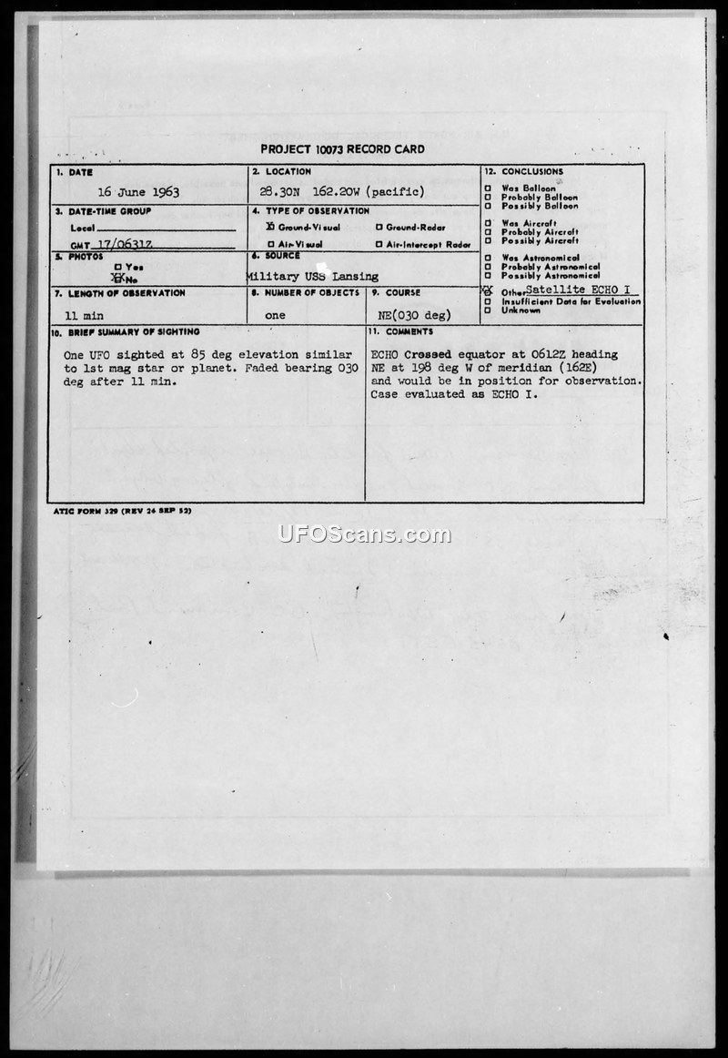 On 16 June 1963, the USS Lansing reported a sighting of an unidentified aerial object in the Pacific Ocean at coordinates 28.30N 162.20W. The object was observed for approximately 11 minutes, from 0631Z to 0642Z. The witness described the object as having an 85-degree elevation and appearing similar to a first-magnitude star or planet. The object was noted to have a bearing of 030 degrees before fading. Weather conditions at the time were reported as clear with no unusual phenomena and seas at two feet. The 326 Air Division KUNIA facility in Hawaii conducted an evaluation of the report. Based on orbital data, it was determined that the ECHO I satellite crossed the equator at 0612Z, heading northeast at 198 degrees west of the meridian (162E), which placed it in the appropriate position for the observation made by the USS Lansing. Consequently, the case was officially evaluated as an observation of the ECHO I satellite and deemed to pose no threat. The report was disseminated through various military channels, including CINCPACAF, CINCNORAD, and the Department of the Air Force, with copies delivered to NIN, DIA, and XOPX.