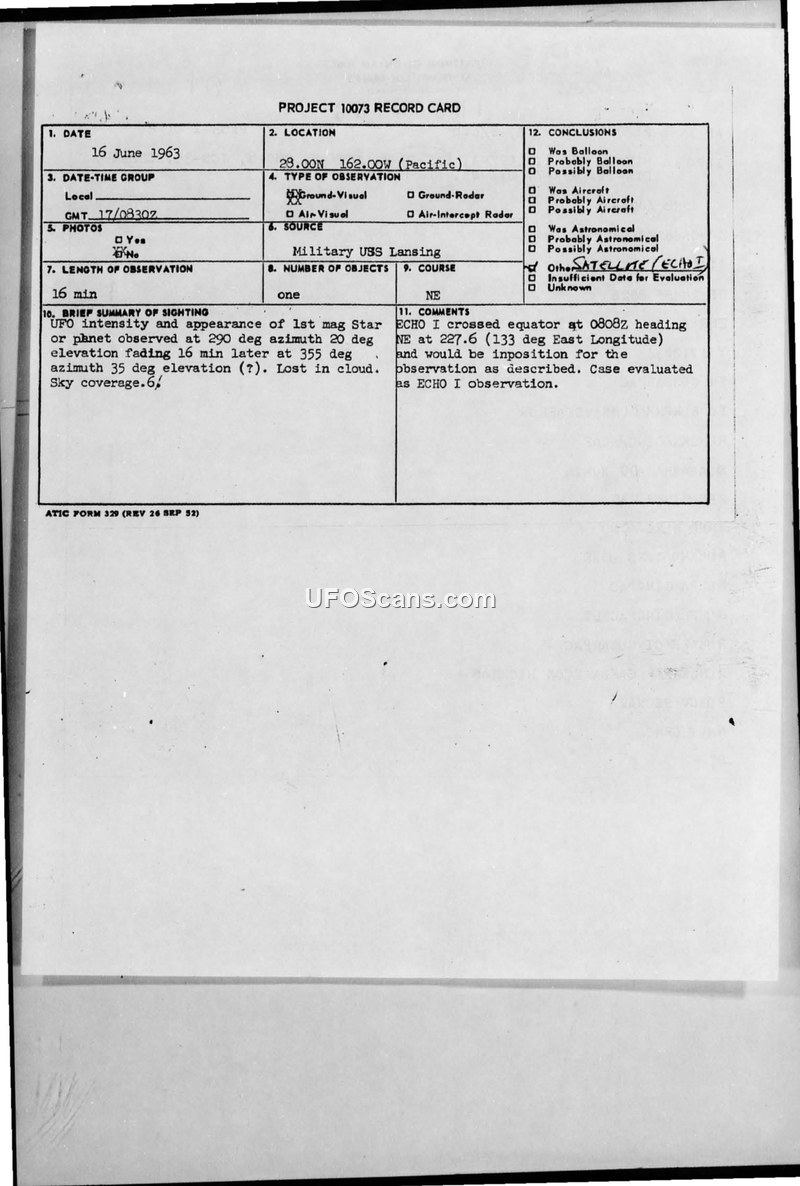 A UFO sighting reported by the USS Lansing on 16 June 1963 was officially identified by ATIC as the ECHO I satellite. The documentation includes the original record card and subsequent military staff messages confirming the evaluation.