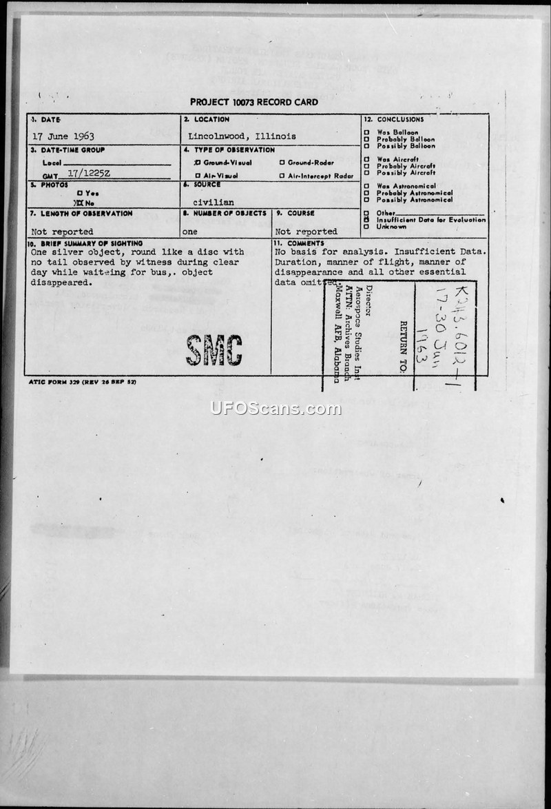 A 21-year-old witness reported a silver, disc-shaped object in Lincolnwood, Illinois, on 17 June 1963. The Air Force concluded there was insufficient data to analyze the event.