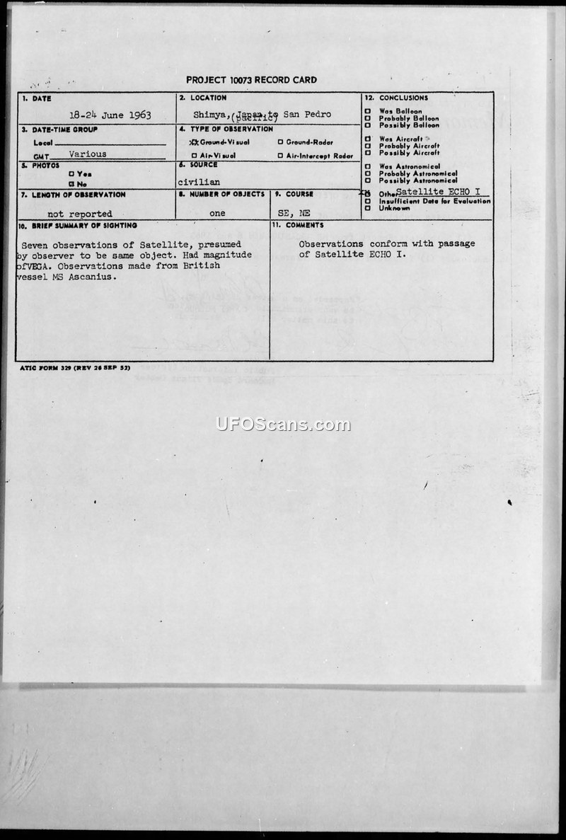 This document consists of a Project 10073 record card, a memorandum from the U.S. Naval Oceanographic Office, and a Ship Visit Report detailing a series of satellite sightings. Between 18 and 24 June 1963, the crew of the British vessel MS Ascanius, while on a passage from Shimya, Japan, to San Pedro, California, observed an object on seven separate occasions. The observer, 3rd Mate E. W. Alkin, noted the object's movement and magnitude, comparing it to the star Vega. The report was forwarded by the U.S. Naval Oceanographic Office to J. S. Lacey at NASA's Goddard Space Flight Center on 20 August 1963. The official conclusion reached by the evaluating authorities was that the observations were consistent with the orbital passage of the satellite ECHO I.