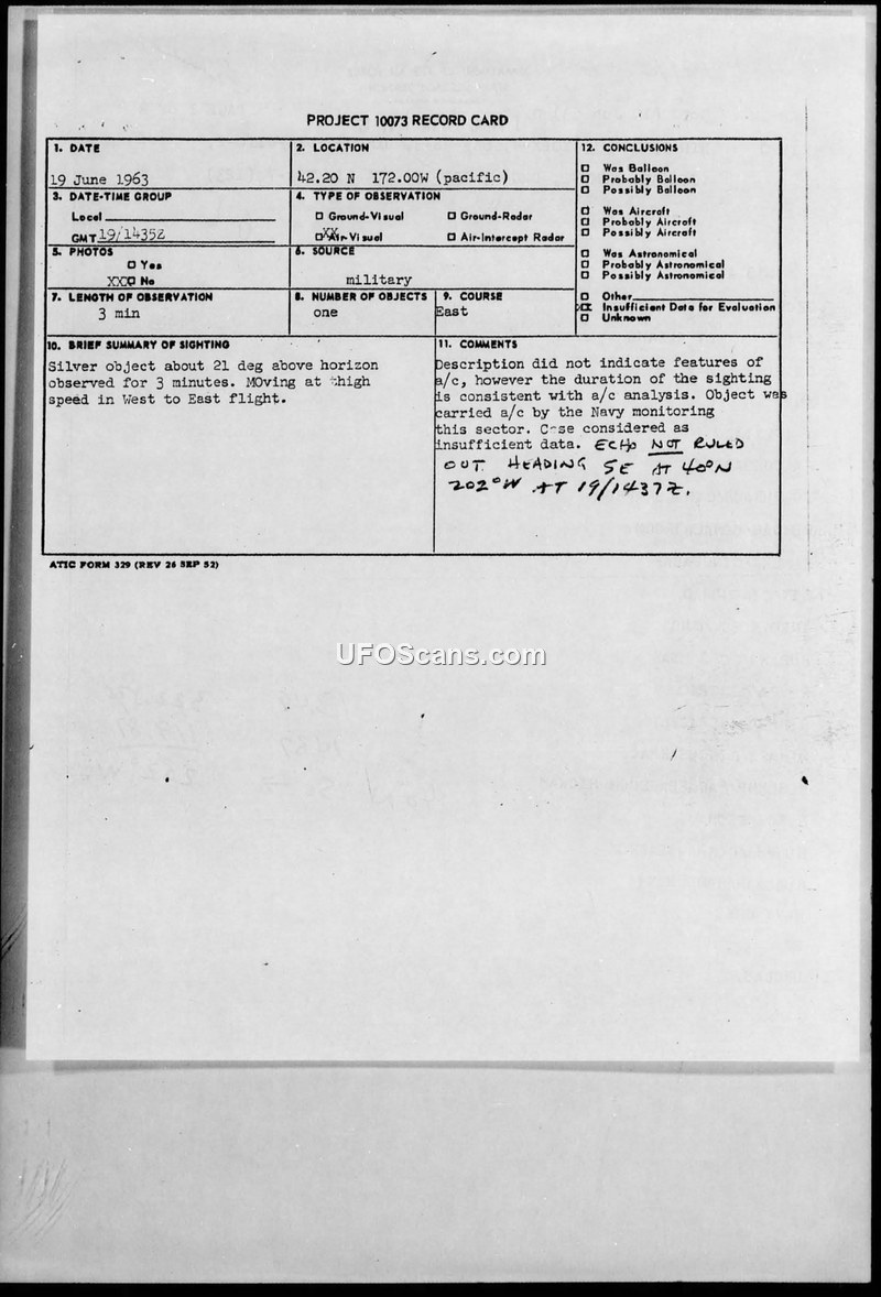 A silver object was observed in the Pacific on 19 June 1963 for three minutes. The Air Force evaluated the report as having insufficient data to identify the object.