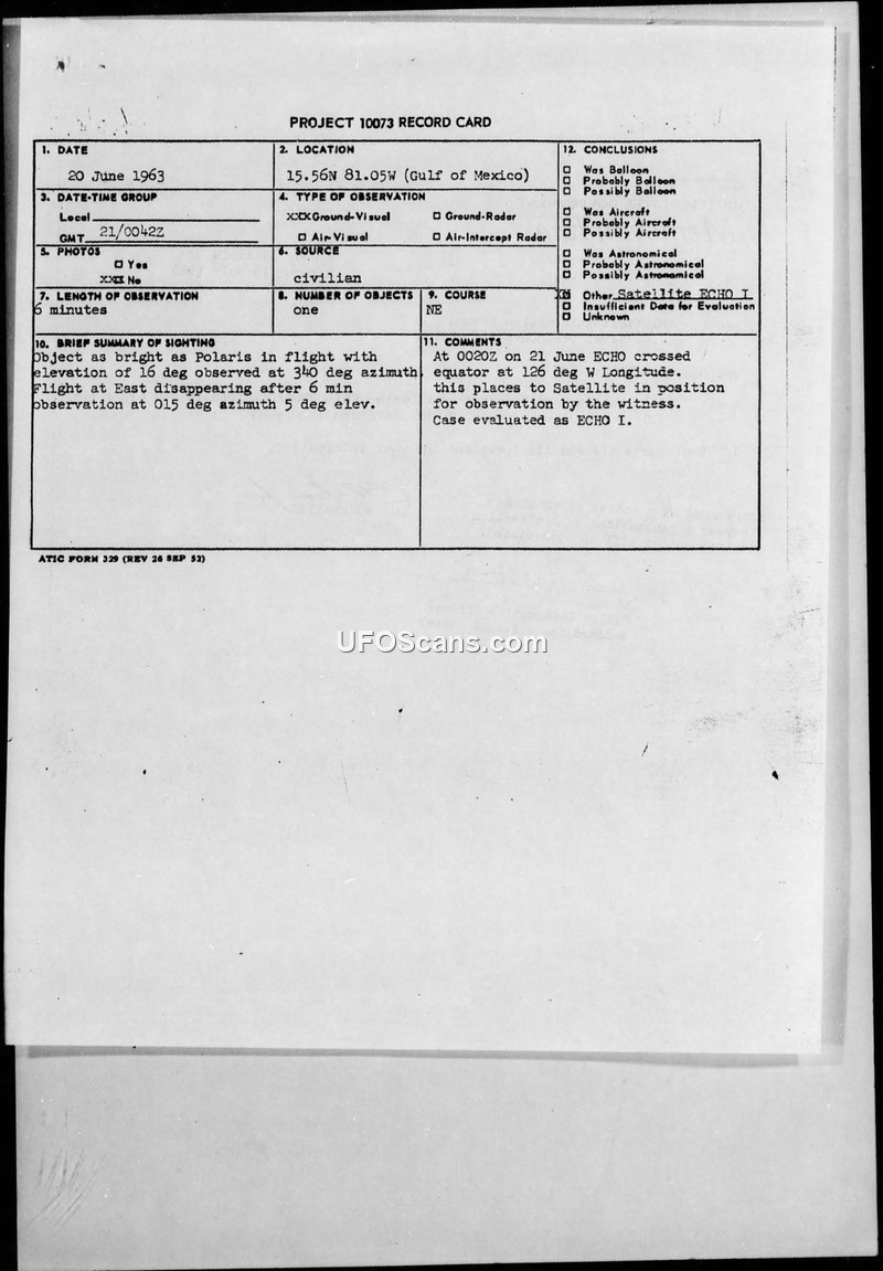 This document file contains a Project 10073 record card and supporting correspondence regarding a sighting of an unidentified object reported by the crew of the Liberian ship PENSACOLA on 20 June 1963. The witness, Master Emilio Fernandes Goitia, reported observing an object as bright as Polaris in the Gulf of Mexico at 15.5N 81.05W. The object was observed for six minutes, moving in an easterly direction before disappearing. The sighting was subsequently investigated by the U.S. Naval Oceanographic Office and evaluated by ATIC. Based on orbital data for the ECHO I satellite, which crossed the equator at 126 degrees West longitude at 0020Z on 21 June 1963, the sighting was officially identified as the ECHO I satellite. The file also includes a brief, separate observation report from the M.V. FERNGATE dated 1 July 1963, which also noted a satellite appearing as a bright star moving north.