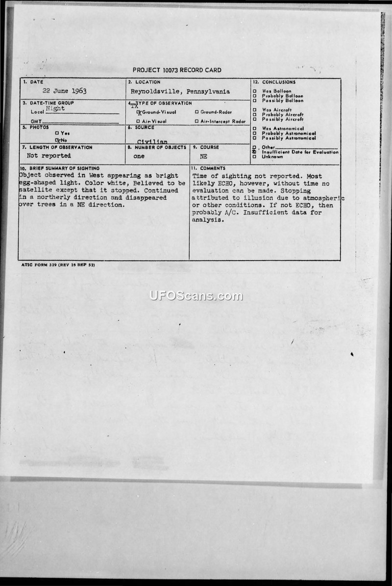 Project 10073 Record Card — Reynoldsville, Pennsylvania, 22 June 1963