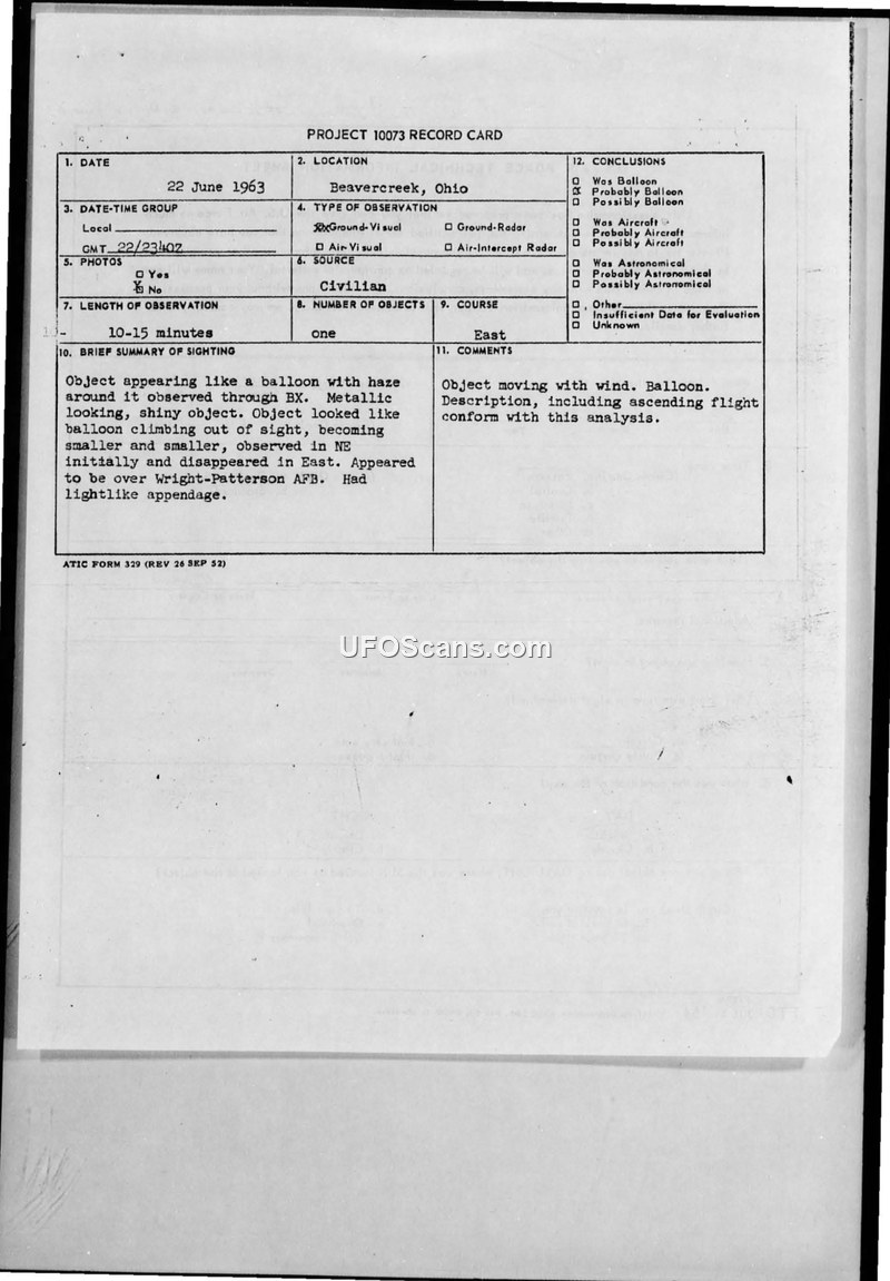 Project 10073 Record Card — Beavercreek, Ohio, 22 June 1963