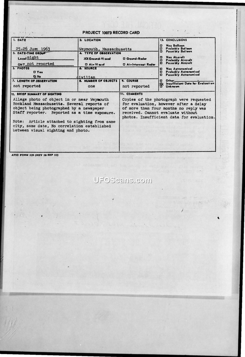 Project 10073 Record Card — Weymouth, Massachusetts, 25-26 June 1963