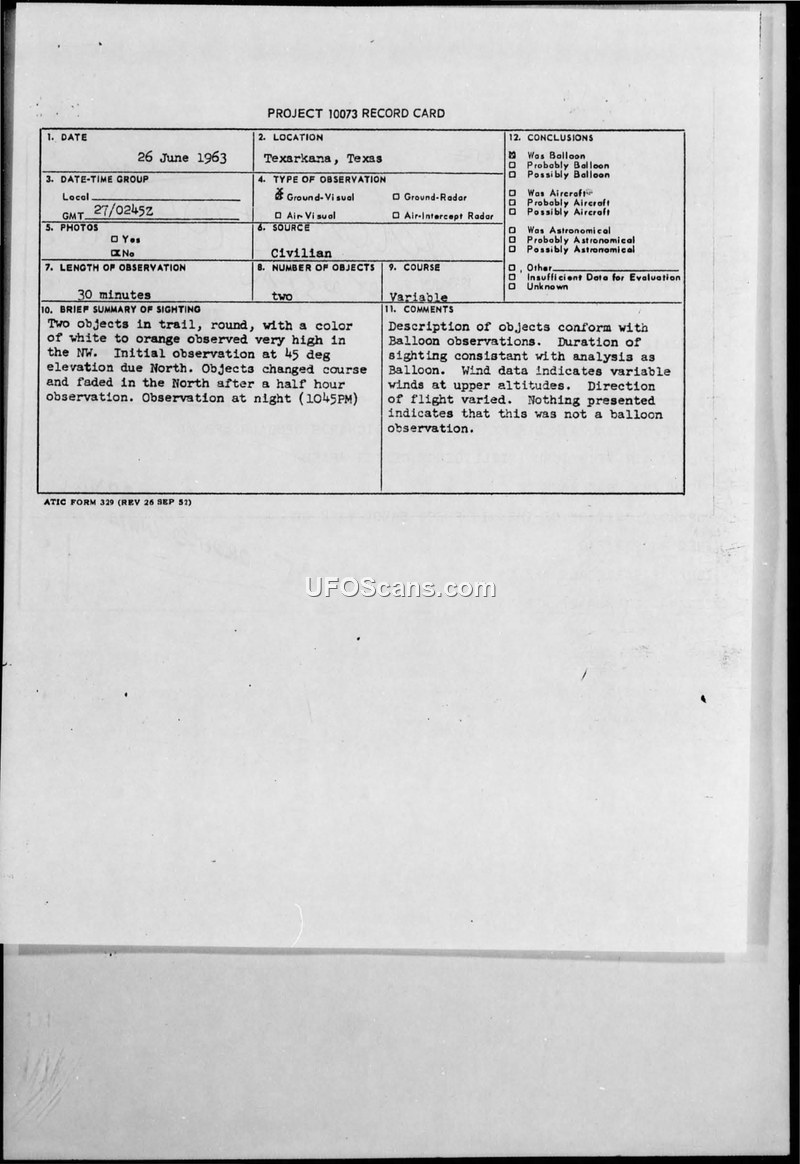 A civilian in Texarkana, Texas, reported two white-to-orange objects on June 26, 1963. The Air Technical Intelligence Center concluded the objects were balloons based on meteorological data.