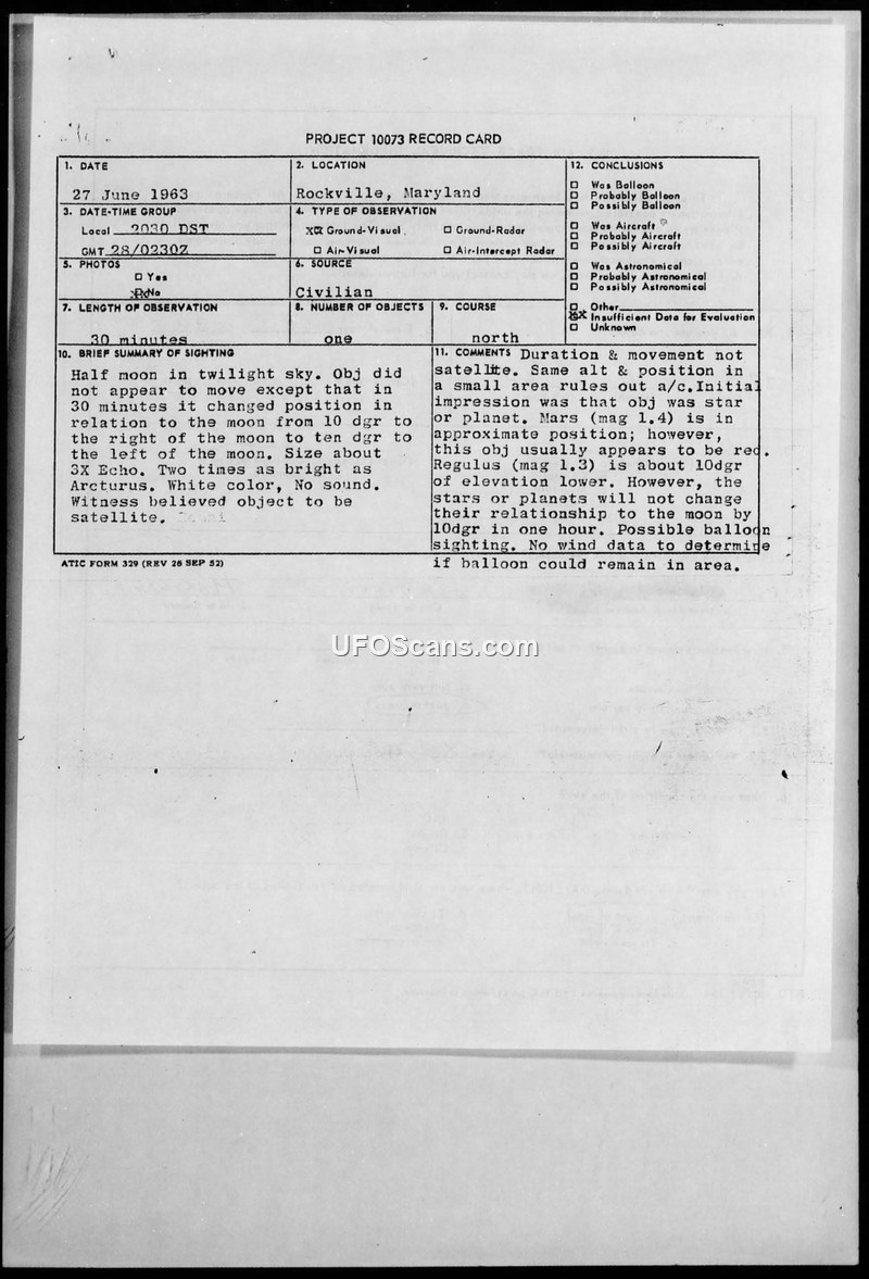 On June 27, 1963, a civilian witness in Rockville, Maryland, observed an unidentified aerial object in the twilight sky for approximately 30 minutes. The witness, who was outdoors at the time, described the object as white, silent, and approximately three times as bright as the star Arcturus. The witness initially suspected the object was a satellite, specifically comparing its size to an Echo-type balloon. Over the course of the observation, the object appeared to change its position relative to the moon, moving from 10 degrees to the right of the moon to 10 degrees to the left. The witness reported the object's motion as being toward the north. The official record card for Project 10073 notes that the duration and movement were inconsistent with a satellite, and the specific altitude and position in a small area ruled out conventional aircraft. Investigators considered the possibility of the object being a star or planet, noting that Mars was in the approximate vicinity, but dismissed this because the object's appearance and movement relative to the moon were inconsistent with celestial bodies. The final conclusion recorded on the card was 'Insufficient Data for Evaluation,' with a note suggesting a possible balloon sighting, though the lack of wind data prevented a definitive determination.