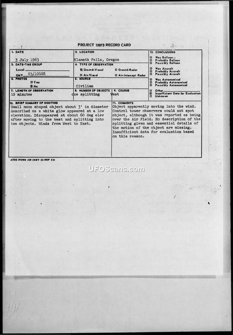 Project 10073 Record Card — Klamath Falls, Oregon, 3 July 1963