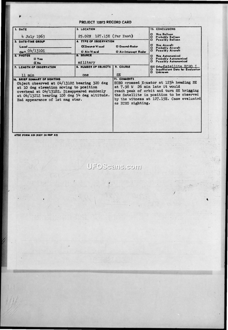 On July 4, 1963, a sighting of an unidentified object was reported by personnel aboard the USS COOK at coordinates 25.02N 127.15E in the Far East. The object was observed for 11 minutes, beginning at 1310Z. It was described as having the appearance of a first-magnitude star, moving from a bearing of 320 degrees at 10 degrees elevation to a position overhead, before disappearing suddenly at 1321Z at a bearing of 108 degrees and 54 degrees altitude. The report was processed under Project 10073. Following an evaluation of the object's trajectory and orbital data, it was determined that the object was the ECHO I satellite. The analysis noted that the satellite crossed the equator at 1234 heading northeast, and given the timing and the observer's position, it would have reached the peak of its orbit and turned southeast, placing it in the observed position. The report includes naval message traffic confirming the details of the observation and the identification of the witnesses, LCDR J. E. White and BM1 H. F. Caudle.