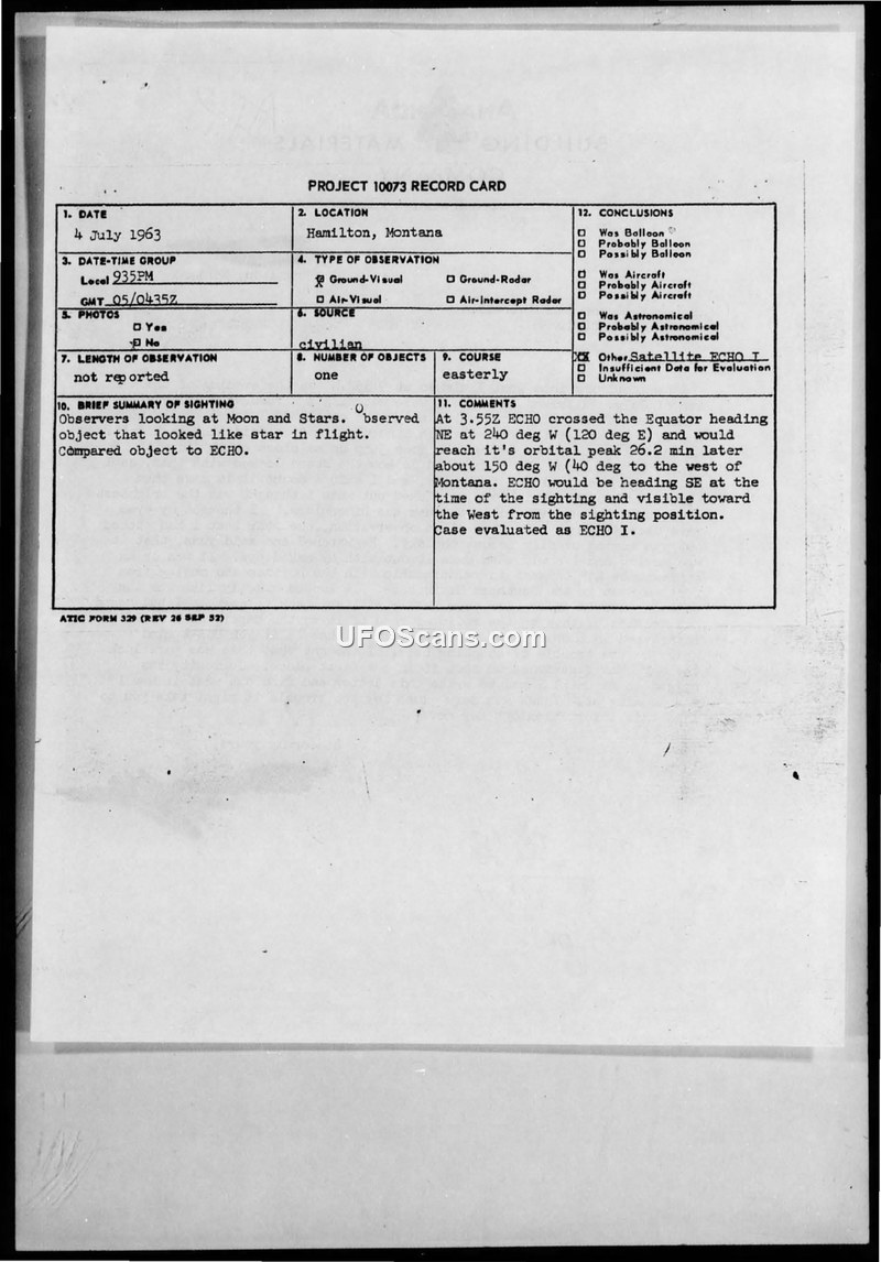 Project 10073 Record Card — Hamilton, Montana, 4 July 1963