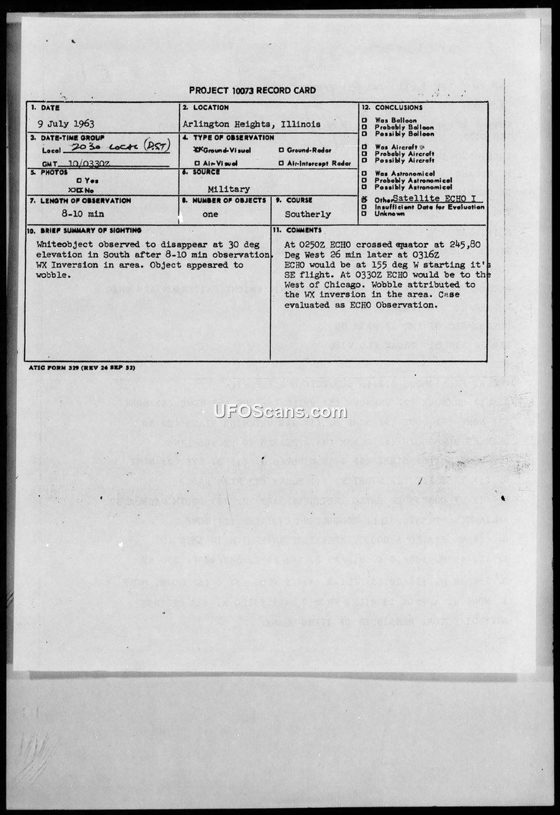A retired military officer reported a white, wobbling object in the sky over Arlington Heights, Illinois, on July 9, 1963. Military investigators identified the object as the satellite ECHO I, attributing the observed motion to atmospheric conditions.