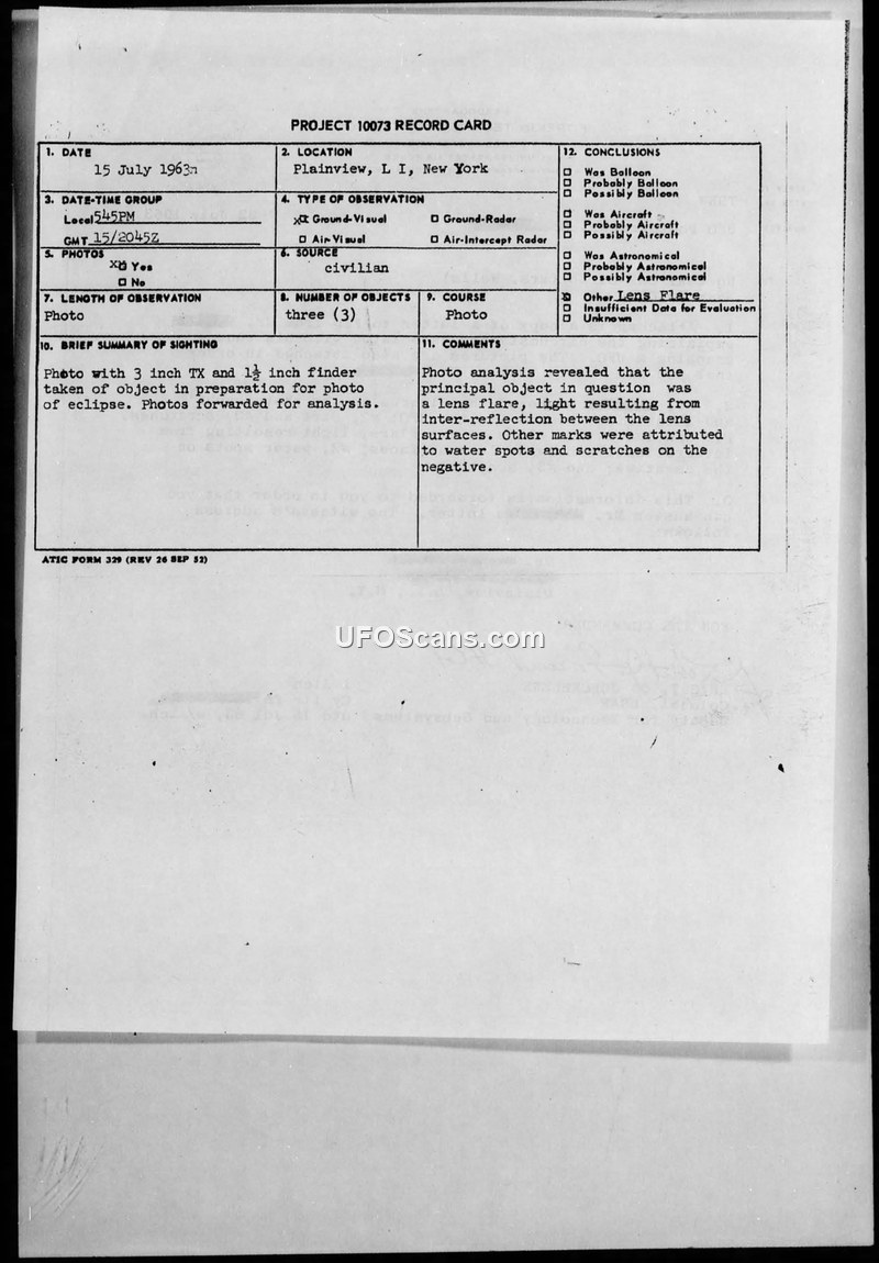 On July 15, 1963, a civilian in Plainview, Long Island, New York, captured photographs while taking test exposures in preparation for an upcoming solar eclipse. The individual was using a 3-inch telescope with a 1.5-inch finder and had attached a 35mm camera to the finder without the camera's lens. After developing the film, the witness observed an unidentified object in the images and submitted them to the Air Technical Intelligence Center (later the Foreign Technology Division) for analysis. The case was processed under Project 10073. The Foreign Technology Division conducted an analysis of the photographs, which included three 8x10 inch prints, one 7x10 inch print, and five 5x4 inch negatives. The witness had numbered the figures on the photographs, identifying them as #1 (the UFO), #2 (dirt), and #3 (scratches). The official Air Force conclusion was that the primary object, labeled #1, was a lens flare caused by light inter-reflection between the lens surfaces. The other markings were identified as water spots and scratches on the negative. Major Maston M. Jacks of the Public Information Division formally communicated these findings to the witness on July 30, 1963, and returned the photographs.
