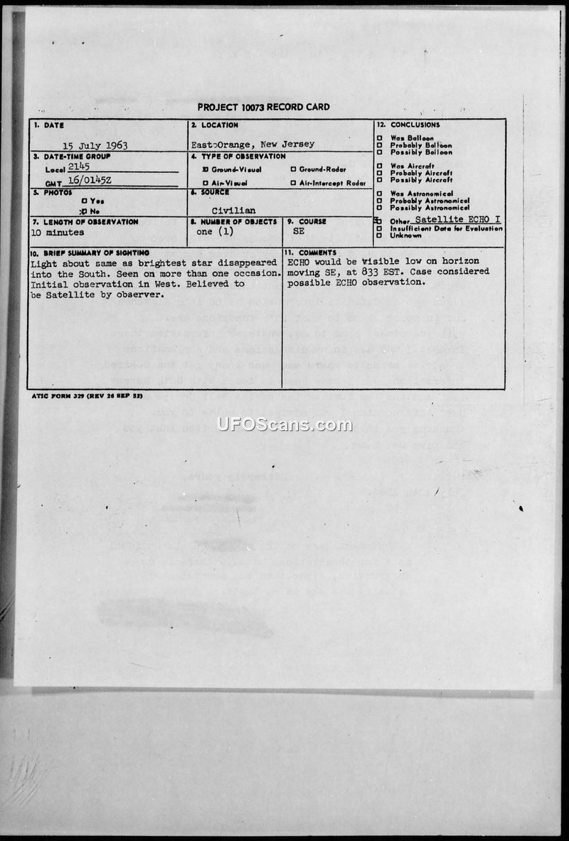 This document contains a collection of records regarding a UFO sighting reported by a civilian in East Orange, New Jersey, on 15 July 1963. The witness, who lived on the 18th floor of an apartment building, reported observing a light in the sky that appeared to follow a consistent path, which they initially believed to be a satellite. The witness described the object as having the brightness of a star and noted that it appeared in the western sky around 9:45 PM, moving toward the north-east, and was seen on multiple occasions. The witness actively sought information about the object, contacting the National Aero Space Administration and the Bell Groupe, and was eventually advised to write to the Air Force. The Foreign Technology Division of the Air Force investigated the report and concluded that the sighting was likely an observation of the ECHO satellite, noting that the object's behavior and timing were consistent with the satellite's orbital path. The Air Force provided the witness with an ECHO satellite schedule for the Newark, New Jersey area to assist in future observations. The file includes the original Project 10073 record card, correspondence between the witness and the Air Force, and the technical information sheets completed by the witness.