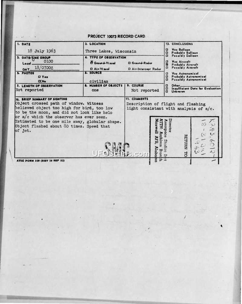 This document contains a Project 10073 record card and associated correspondence regarding a UFO sighting reported by a civilian in Three Lakes, Wisconsin. On July 18, 1963, the witness, who was staying at the Bridgewood Cabins, observed a globular object at approximately 01:00 local time. The witness described the object as moving at the speed of a jet, crossing the path of their window, and flashing approximately 80 times. The witness noted that the object was too high to be a bird and too low to be the moon, and did not resemble any known aircraft or helicopters. The witness also mentioned that it was windy at the time, which made it difficult to determine if the object produced any sound. The report was forwarded by the Foreign Technology Division to Hq USAF SAF-OI 3b on July 31, 1963. A subsequent memorandum from Major Maston M. Jacks of the Office of the Secretary of the Air Force, dated August 12, 1963, confirms receipt of the letter and provides the witness with information regarding Project Blue Book. The official conclusion recorded on the project card states that the description of the flight and the flashing light was consistent with an analysis of an aircraft.