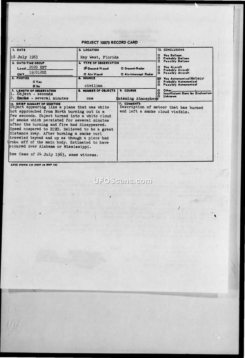 This document contains records from Project 10073 regarding two UFO sightings reported by a witness in Key West, Florida, on July 18 and July 24, 1963. The witness, associated with Marine Electronics Co., reported seeing an oblong, white-hot object approaching from the North on both occasions. The object reportedly burned out, leaving a persistent white smoke cloud that remained visible for several minutes. The witness noted that the object traveled in a straight course due South and appeared to be at a great distance. The Foreign Technology Division of the Air Force Systems Command initiated an inquiry with Eglin Air Force Base to determine if any military operations or munitions testing could explain the sightings. The response from Eglin AFB, dated November 12, 1963, stated that a search of test and base operations records failed to reveal any possible source for the sightings. The official conclusion recorded on the Project 10073 record cards is that the observations were likely meteors, despite the witness's assertion that the objects did not behave like falling stars.