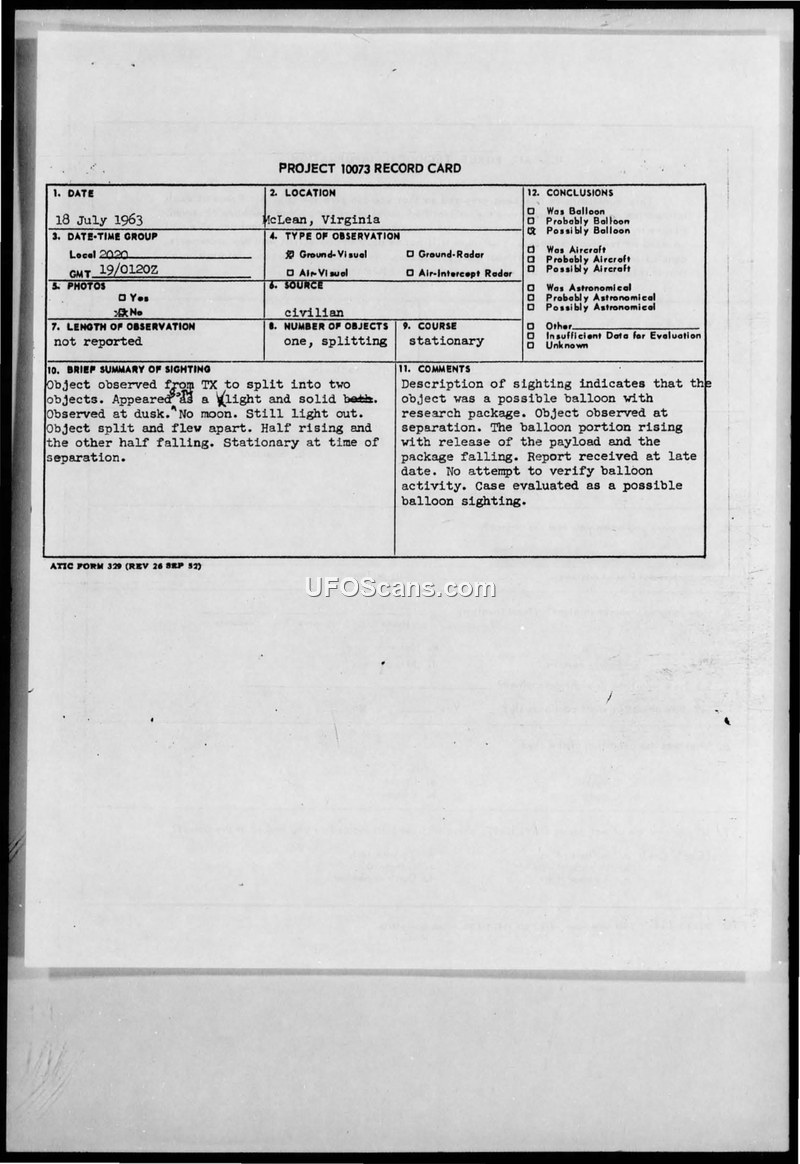 A civilian in McLean, Virginia, reported a stationary object splitting into two parts on July 18, 1963. The Air Force evaluated the incident as a possible balloon with a research package.