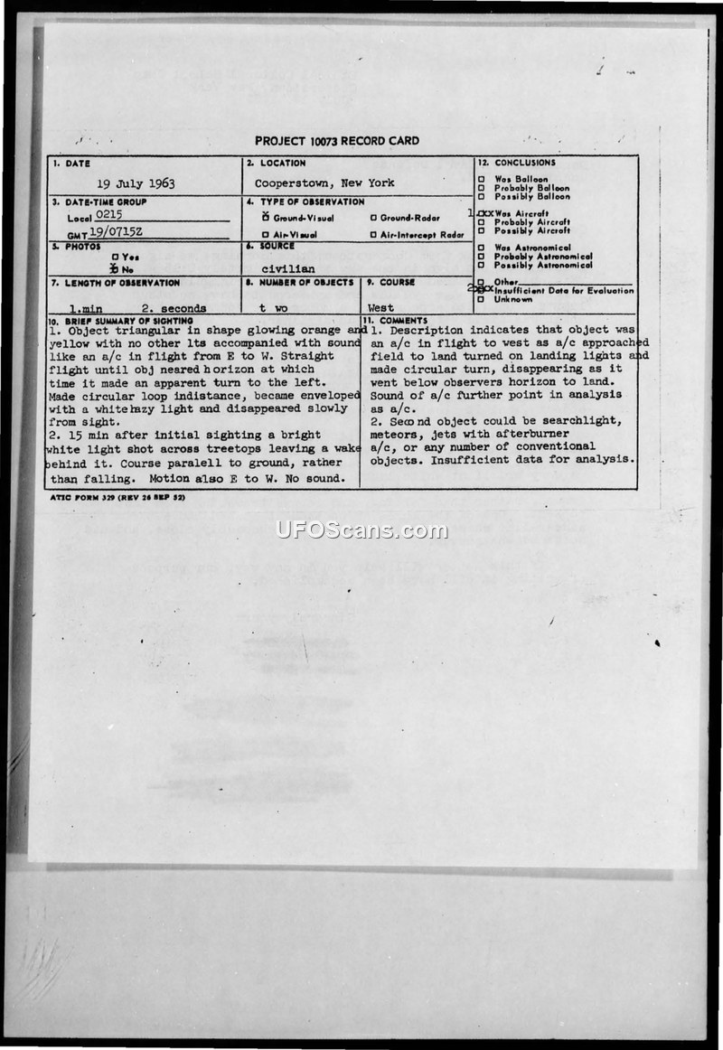 A civilian report of two unidentified aerial objects near Cooperstown, NY, in July 1963 was evaluated by the Air Force. The military concluded the first object was likely an aircraft and the second remained unidentified due to insufficient data.