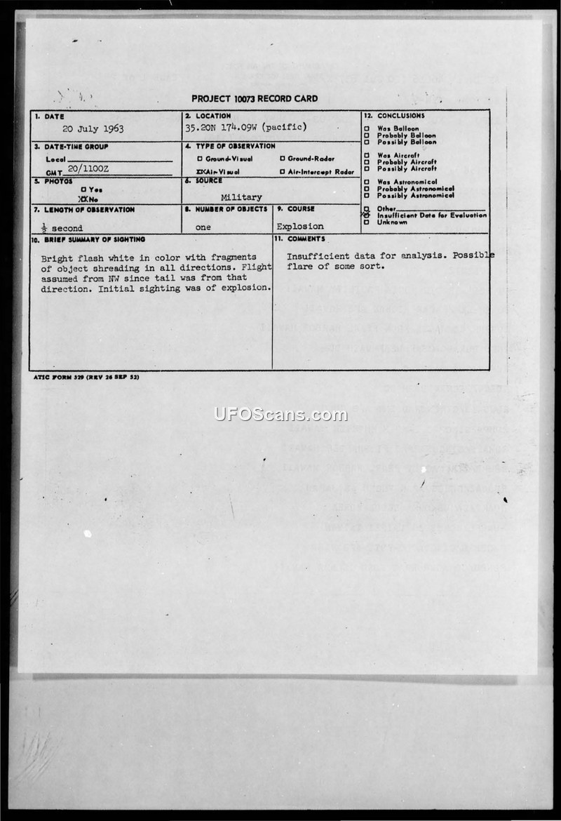On July 20, 1963, at 1100Z, a CIRVIS report was filed regarding an aerial sighting at coordinates 35.20N 174.09W in the Pacific. The witness reported a bright white flash accompanied by fragments spreading in all directions. The duration of the event was approximately one-half second. The object was observed at an altitude of 40 degrees above the horizon, with an assumed flight path from the northwest, indicated by a tail. The initial observation was described as an explosion. The report was transmitted to the CIA, with advance copies delivered to XOPX, NIN, and DIA. The official evaluation concluded that there was insufficient data for analysis and suggested the phenomenon might have been a flare of some sort.