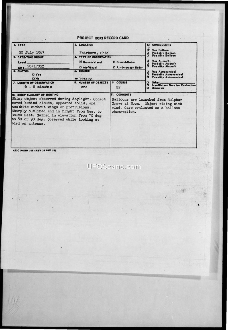 Project 10073 Record Card — Fairborn, Ohio, 20 July 1963