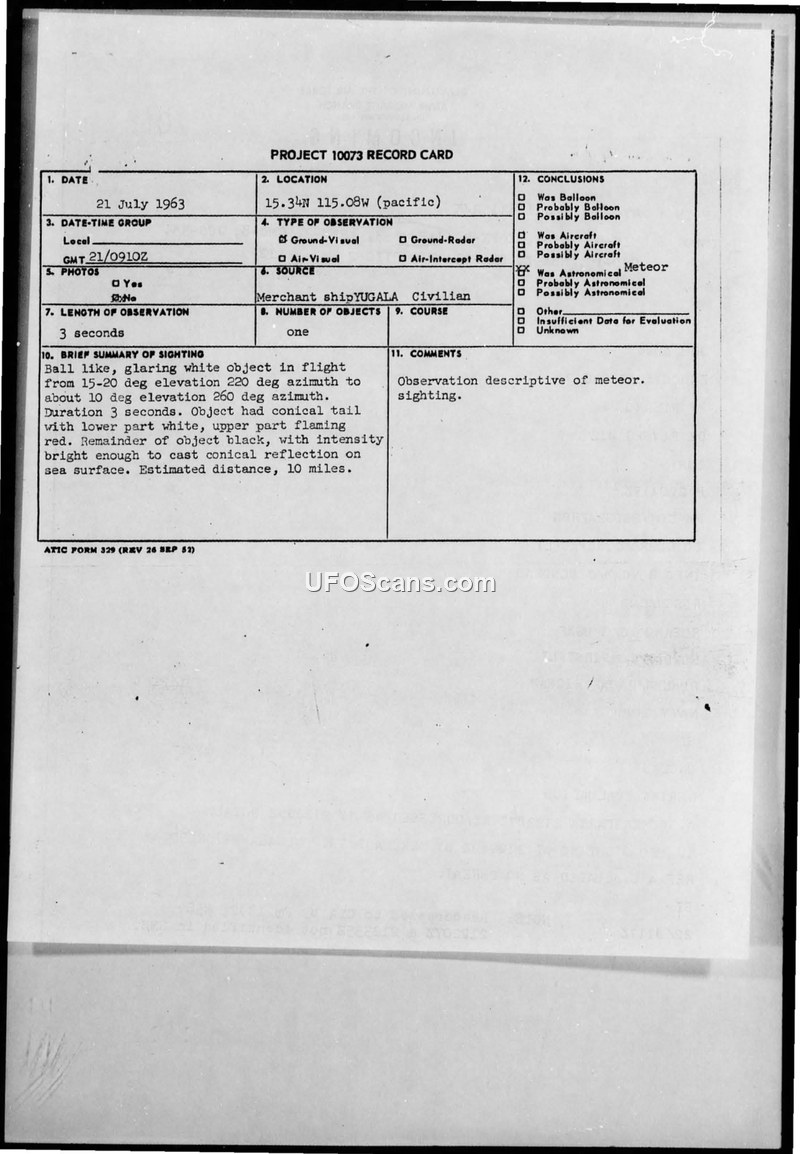 Project 10073 Record Card: Sighting by Merchant Ship YUGALA, 21 July 1963