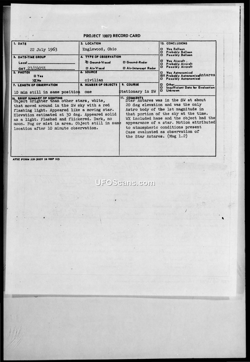 A civilian report of a stationary, flashing light in Englewood, Ohio, was investigated by the U.S. Air Force. The object was officially identified as the star Antares, with its perceived movement attributed to atmospheric haze.