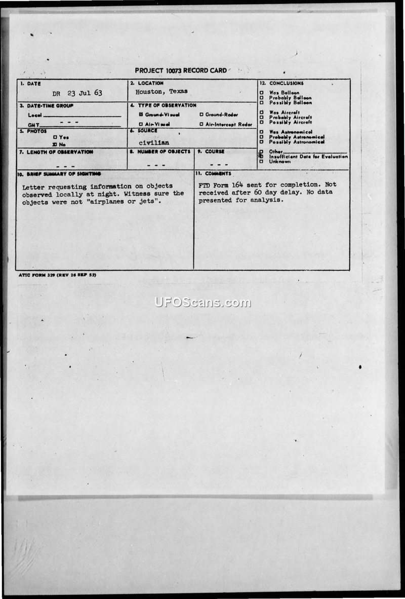 PROJECT 10073 RECORD CARD — Houston, Texas, 23 July 1963