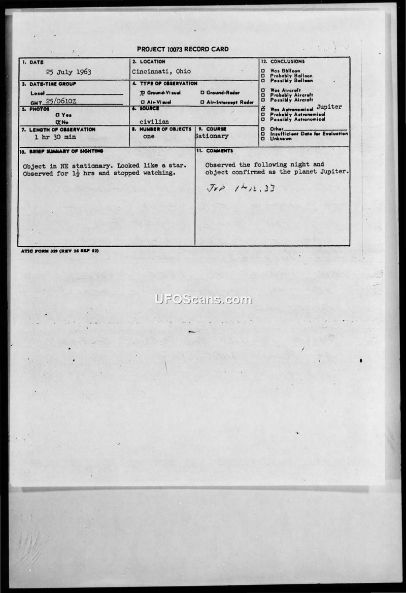 This document is a Project 10073 record card detailing a civilian sighting of an unidentified aerial phenomenon in Cincinnati, Ohio, on July 25, 1963. The witness, who was sitting on a porch, reported observing a stationary object in the Northeast that looked like a large, bright star. The observation lasted for one hour and thirty minutes. The witness noted that the object had a color similar to moonlight and reported a humming sound, though they were uncertain if the sound originated from the object. The witness was not wearing their glasses at the time of the sighting. The Air Force investigation concluded that the object was the planet Jupiter. This conclusion was reached after the witness was instructed to observe the sky the following night, July 26, 1963, at the time the planet would rise. The witness subsequently confirmed that the object was indeed Jupiter. Investigators suggested that atmospheric refraction may have contributed to the initial misidentification of the planet.