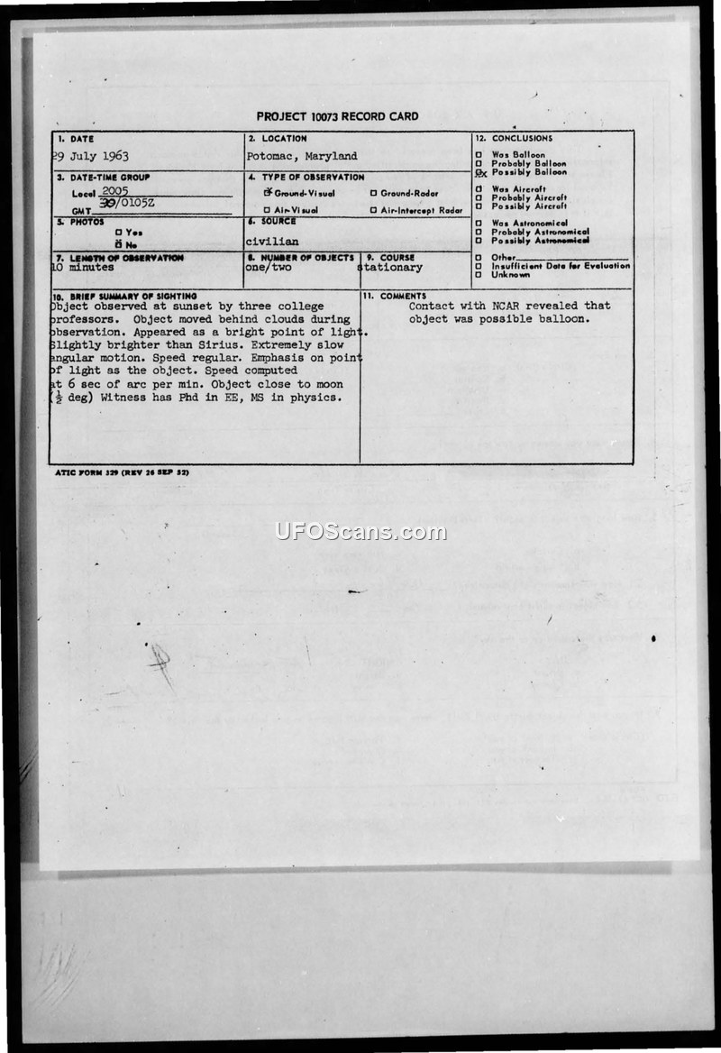 On July 29, 1963, a PhD-holding electrical engineer and physicist observed an unidentified aerial object in Potomac, Maryland. The witness, who was with two other college professors, described the object as a bright point of light, slightly brighter than Sirius, which appeared stationary but exhibited extremely slow, regular angular motion. The object was observed for approximately 10 minutes near the moon before moving behind clouds. The witness reported the sighting to the U.S. Air Force using a technical information questionnaire. The Foreign Technology Division (FTD) at Wright-Patterson Air Force Base investigated the report, forwarding it to Dr. J. Allen Hynek at Northwestern University. Further investigation involved contacting Mr. Vince Lally at the National Center for Atmospheric Research (NCAR). It was determined that three research balloons had been launched from Palestine, Texas, on July 24, 1963. One of these balloons was tracked across the United States, through Canada, and back down through Maine and New Hampshire. The tracking was lost after 102 hours with the balloon heading southwest toward the eastern coastal states. The Air Force concluded that the estimated flight path placed the balloon in the vicinity of Maryland at the time of the sighting. Although the instrument package from the balloon was never recovered, the Air Force informed the witness that this was a possible cause for the sighting. The correspondence between the Air Force and the witness, dated November 1963, apologizes for the delay in providing this evaluation.