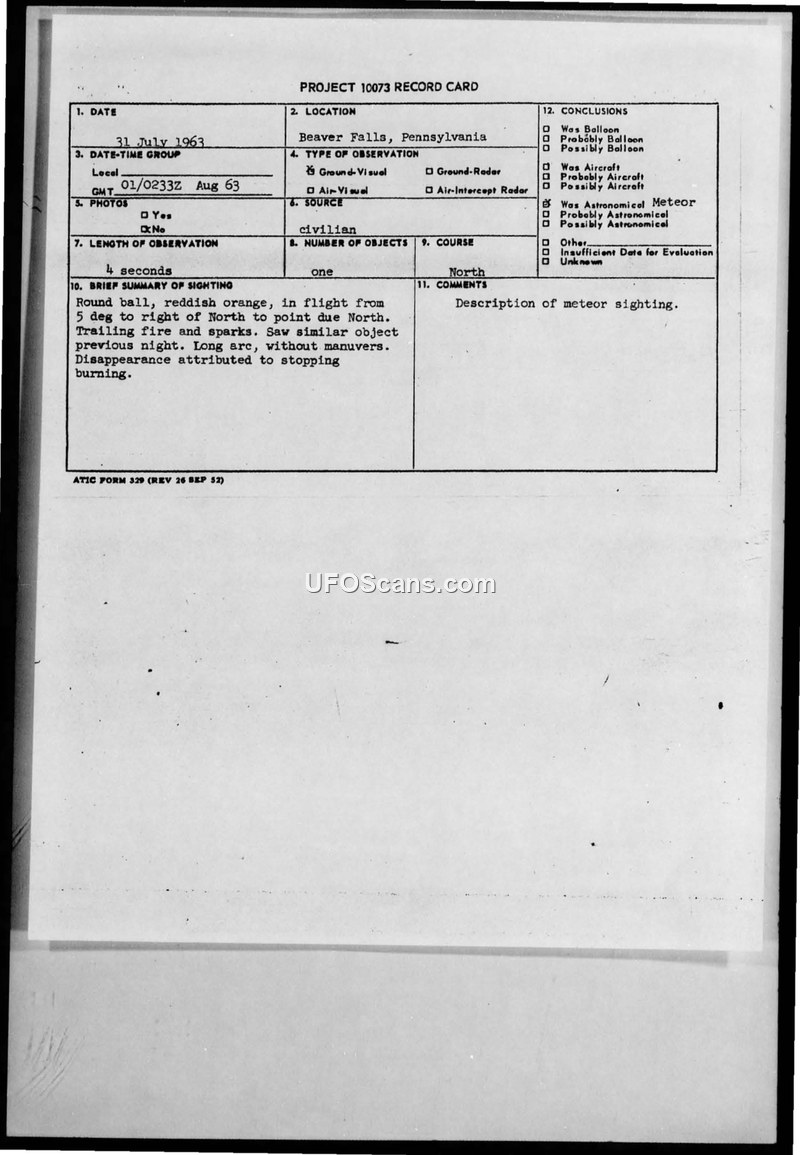 A civilian in Beaver Falls, PA, reported a 4-second sighting of a reddish-orange, fire-trailing object on July 31, 1963. The military investigation concluded the object was an astronomical meteor.
