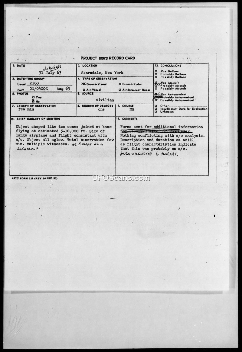 A civilian reported a cone-shaped object in Scarsdale, New York, on July 31, 1963. The Air Force concluded the object was likely an aircraft.