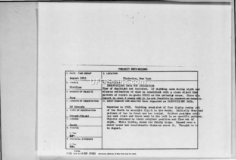 This document contains a Project 10073 record regarding a UFO sighting reported in Plainview, New York. The witness, who reported the incident in 1965, described observing four large, white, round lights in the summer of 1963. The objects were initially seen in a formation of two in front and two behind, traveling from the North to the South. The witness noted that the objects shifted positions, with one moving to the right and three to the left, before returning to their original formation and disappearing. The observation lasted approximately ten seconds. The witness stated they were prompted to report the sighting after seeing a similar image in the August 8, 1965, news. The Air Force evaluated the report and concluded that there was insufficient data for a formal investigation, noting that the report was filed two years after the event and lacked critical information such as the time of day. The Air Force suggested that if the sighting occurred at night, the description might be consistent with birds. The file includes correspondence between the witness and the Air Force, as well as internal routing slips from the Foreign Technology Division.