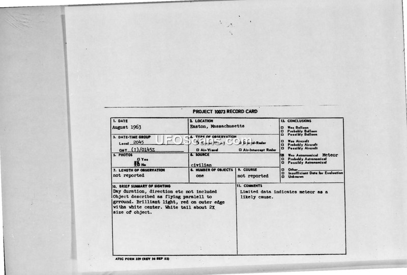 This document collection contains a Project 10073 record card and subsequent correspondence between a civilian witness and the U.S. Air Force regarding UFO sightings in Massachusetts. The witness, a resident of Rockland, Massachusetts, wrote to the Air Force to report his own sighting in Easton in August 1963, as well as a separate sighting reported by his mother-in-law in South Weymouth. The witness expressed a strong interest in ufology, noting his belief that UFOs are real, extraterrestrial, and under intelligent control. He requested information from the Air Force, citing his own research and contact with major newspapers and organizations like NICAP and APRO. The Air Force internal response, authored by the Foreign Technology Division, dismissed the witness's beliefs as an 'act of faith' without scientific support. The official evaluation of the Easton sighting concluded it was likely a meteor, though the report noted that the duration and motion of the object were not provided by the witness. The South Weymouth sighting was deemed to have insufficient data for any analysis. A formal letter dated March 11, 1964, was sent to the witness by Major Maston M. Jacks, stating that in over 8,000 cases investigated over 16 years, there was no evidence that UFOs represent spaceships from other planets, and that all phenomena have logical explanations related to man-made objects, atmospheric conditions, or celestial bodies.