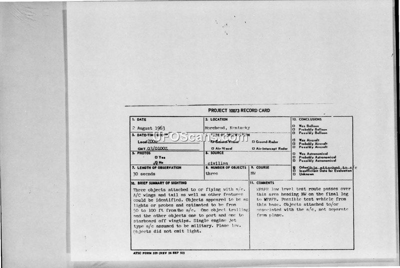A 19-year-old witness in Morehead, Kentucky, reported seeing three objects flying with a jet aircraft on August 2, 1963. The Air Force concluded the objects were likely attached to a test aircraft from Wright-Patterson Air Force Base.