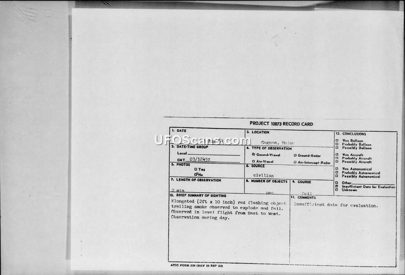 On August 3, 1963, at 1245Z, a civilian witness in Gagnon, Maine, reported observing an unidentified aerial phenomenon. The witness, identified as a maintenance supervisor at a local sanatorium, described the object as an elongated, red, flashing entity measuring approximately two feet by ten inches. The object was observed in level flight, traveling from East to West at an altitude of 3,000 feet. During the two-minute observation, the object trailed smoke before it exploded and disintegrated, with the remaining stick-like debris falling to the ground. The report was processed by the Department of the Air Force under Project 10073. Official military evaluation, provided by a Major SD of the USAF, concluded that the object was a possible meteorite, citing its size as a primary factor. The record card explicitly notes that there was insufficient data for a definitive evaluation.