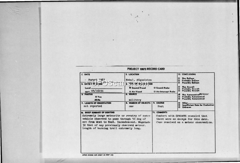 A 1963 sighting of a bright, large object over Kabul was investigated by ATIC. After checking with SPADATS, the event was officially classified as an astronomical meteor.