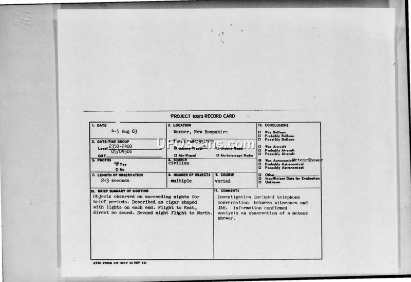 A series of UAP sightings in Warner, New Hampshire, in August 1963 were investigated by the Air Force's Foreign Technology Division. The reports, which included claims of cigar-shaped objects and photographic evidence, were officially attributed to meteors, the star Arcturus, and aircraft.