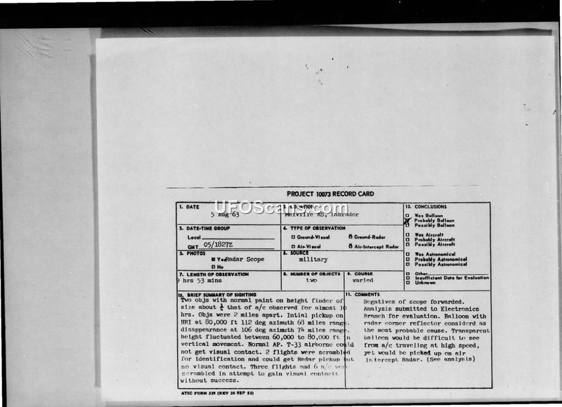 On August 5, 1963, at 1827Z, the 641st Aircraft Control and Warning Squadron at Melville Air Station, Labrador, detected two unidentified objects on radar. The objects were observed for 9 hours and 53 minutes. The radar returns indicated the objects were approximately two miles apart, with a size estimated at one-quarter that of a standard aircraft. The objects exhibited vertical movement, with altitudes fluctuating between 60,000 and 80,000 feet. Despite multiple attempts to intercept the objects using T-33 and F-106 aircraft, no visual contact was ever established. The 641st ACW Squadron forwarded radar scope negatives and photographs to the Foreign Technology Division at Wright-Patterson Air Force Base for evaluation. Vincent D. Bryant of the Foreign Technology Division concluded that the most logical explanation for the radar returns was a balloon, possibly equipped with a radar corner reflector. The report notes that such a balloon could have traveled hundreds of miles and that its small lateral movement and altitude variations were consistent with balloon behavior. The report further suggests that if the balloon were small and silver or transparent, it would be nearly impossible to see visually from a high-speed aircraft, yet it would be easily detected by radar. The evaluation explicitly ruled out equipment malfunction, as multiple radars displayed the same target, and deemed anomalous propagation unlikely. The documentation includes the original Project 10073 record card, correspondence from Major Donald T. Evans, and a photo service request for the processing of 11 negatives and 24 photographs.