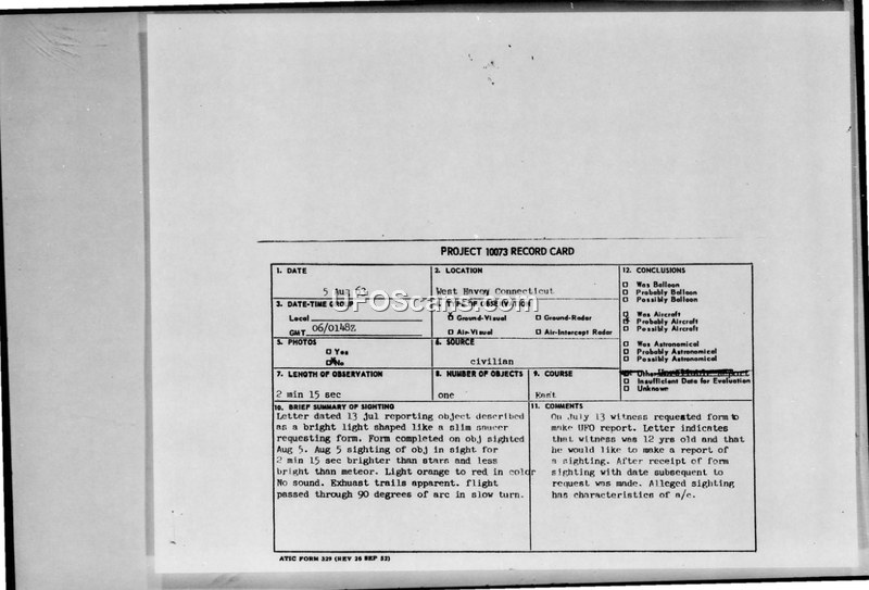 A 12-year-old witness in West Haven, Connecticut, reported a saucer-shaped object with exhaust trails on August 5, 1963. The Air Force concluded the object had characteristics of an aircraft.