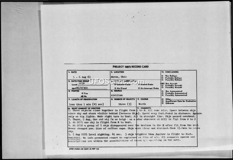 This file documents multiple UFO sightings in Akron, Ohio, in August 1963. The Air Technical Intelligence Center concluded that the reported phenomena were consistent with known aircraft operations.