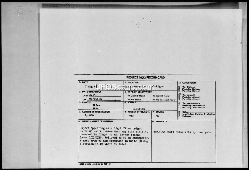 Two UAP sightings reported in August 1963 near Muskallonge Lake, Michigan, were investigated by the Air Force under Project Blue Book. Both incidents were officially concluded to be jet aircraft.