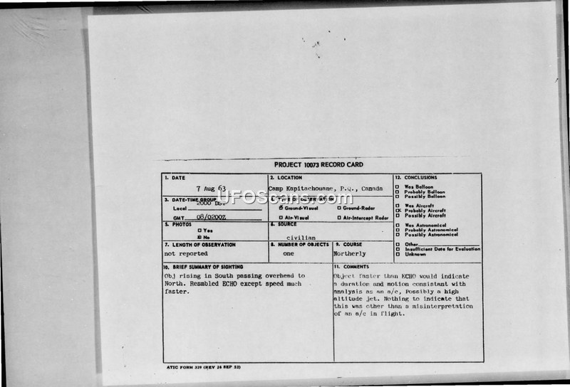 Project 10073 Record Card — Camp Kapitachouane, Canada, 7 August 1963