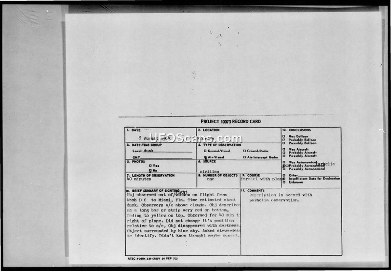 This document contains the records and correspondence regarding a UFO sighting reported by a civilian passenger on a flight from Washington D.C. to Miami, Florida, on August 8, 1963. The witness described observing a long, bar-shaped object, red on the bottom and yellow on the top, which remained in a fixed position relative to the aircraft for approximately 40 minutes before disappearing at dusk. The witness, who was initially uncertain if the object was a sunset or a natural phenomenon, sought identification from the flight stewardess and later reported the event to the Air Force. The Air Force, through Major Maston M. Jacks of the Public Information Division, investigated the report and concluded that the object was a parhelion, commonly known as a 'sundog' or 'mock sun.' The correspondence includes the witness's detailed questionnaire responses, where she noted the object appeared in a clear sky, and the Air Force's subsequent explanations citing Dr. Donald H. Menzel's book, 'The World of Flying Saucers.' The witness continued to correspond with the Air Force, expressing interest in other aerial phenomena and seeking further clarification on the nature of the sighting.